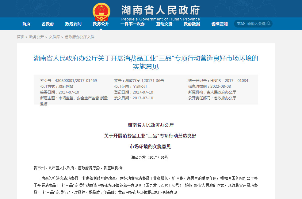 湖南省人民政府办公厅关于开展消费品工业三品专项行动营造良好市场环境的实施意见
