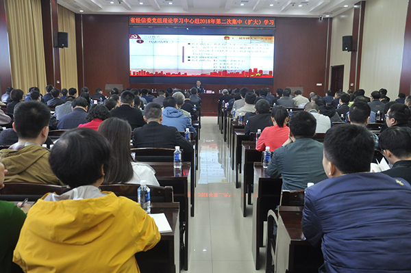 3月28日,省经信委举行2018年度党组理论学习中心组第2次集中扩大学习,专题传达学习全国两会精神。集中学习由委党组书记、主任曹慧泉同志主持,委党组理论学习中心组成员、委机关全体党员干部和委属单位主要负责同志参加学习。